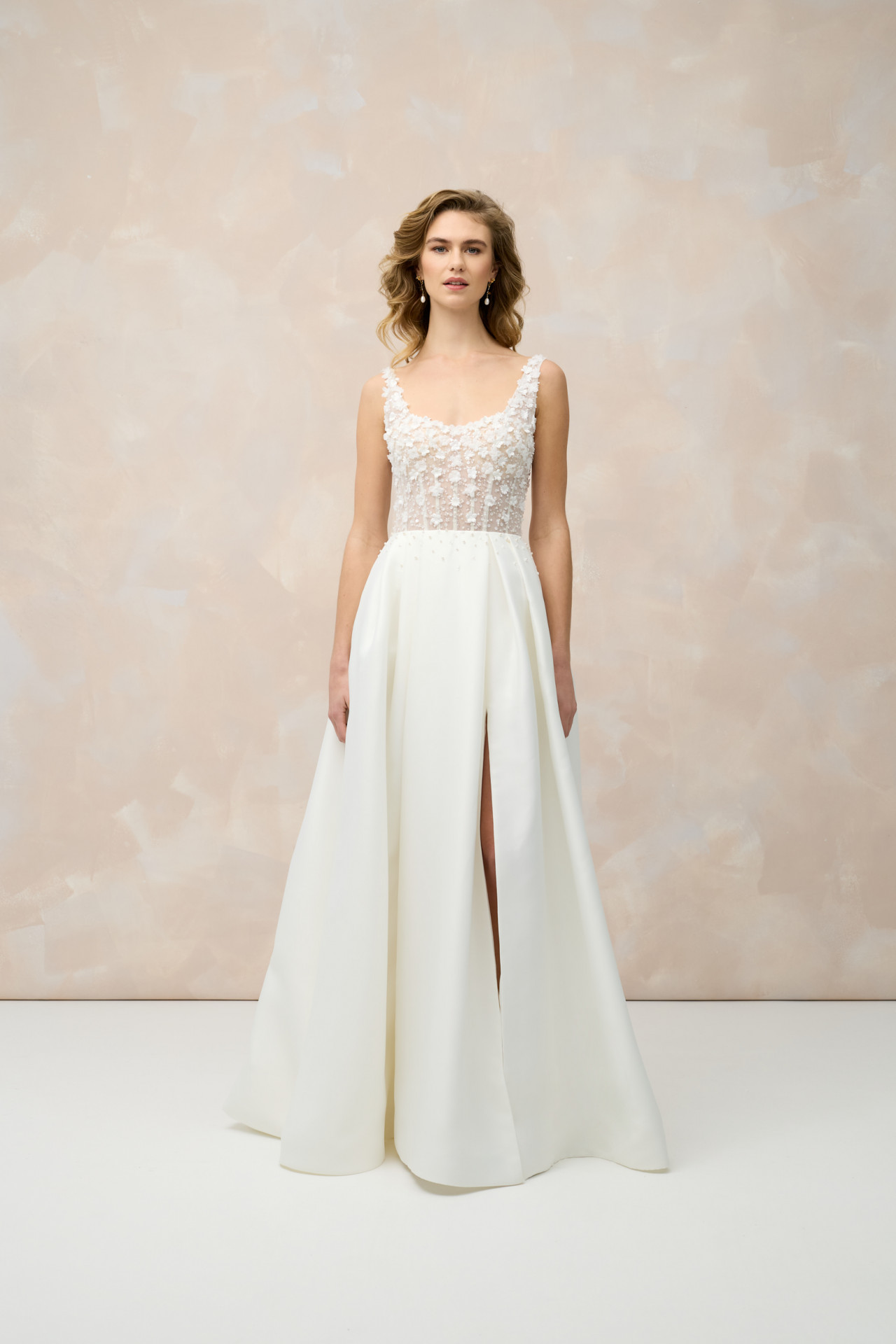 Unsere ausgestellten A-Linien Brautkleider vereinen zeitlose Eleganz mit einer figurschmeichelnden Silhouette, die jede Braut in den Mittelpunkt rückt. Der A-Linien Schnitt, der sanft von der Taille ausgestellt verläuft, sorgt für eine wunderschöne und elegante Linie, die durch ihre klassische Form begeistert.